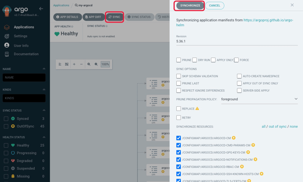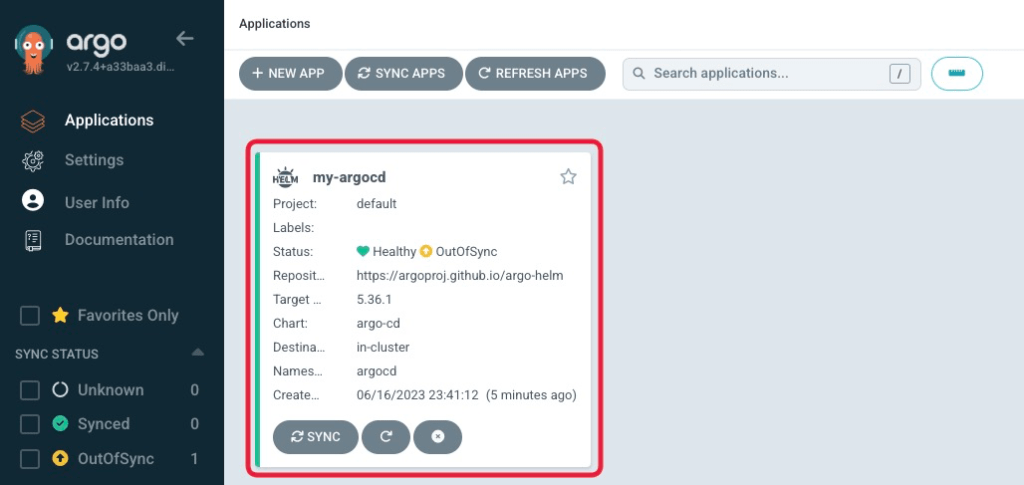 If the synchronization status becomes Synced, it means that ArgoCD successfully manages ArgoCD itself!