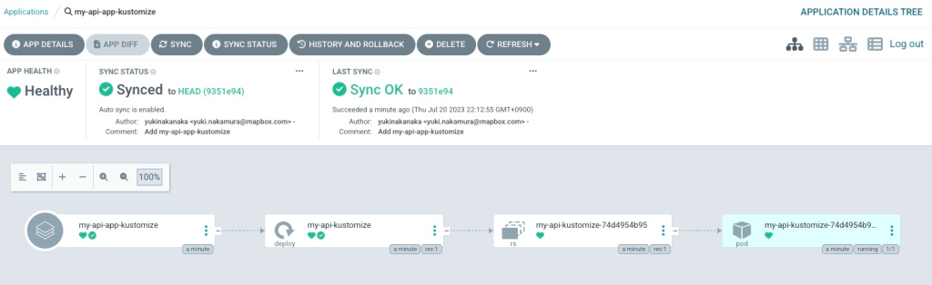 Access ArgoCD and check my-api-app-kustomize. You can see a pod is running!