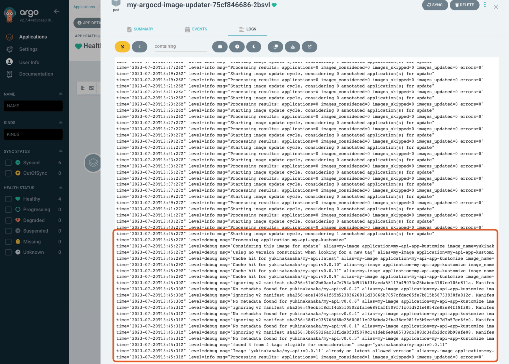 Please check ArgoCD Image Updater’s log. It’s OK if you can see a log like below.