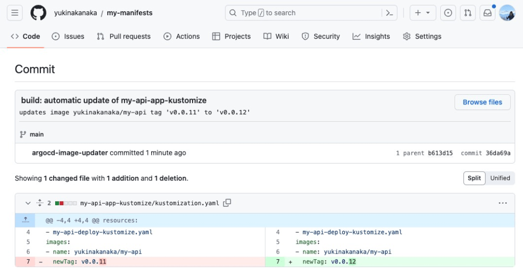 ArgoCD Image Updater should detect a new image on DockerHub and create a commit that updates kustomization.yaml ! Please check your manifests’ GitHub repository. Here is my commit.