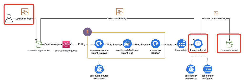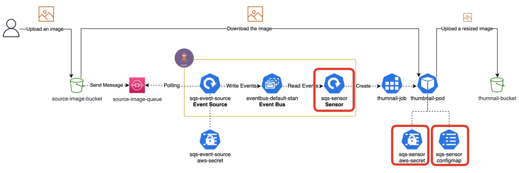 In this application, we will use the SQS queue as an Event Source. When an event happens, the sensor creates a k8s job that downloads a file from the source-image bucket and resizes it, then uploads it to the thumbnail-bucket.